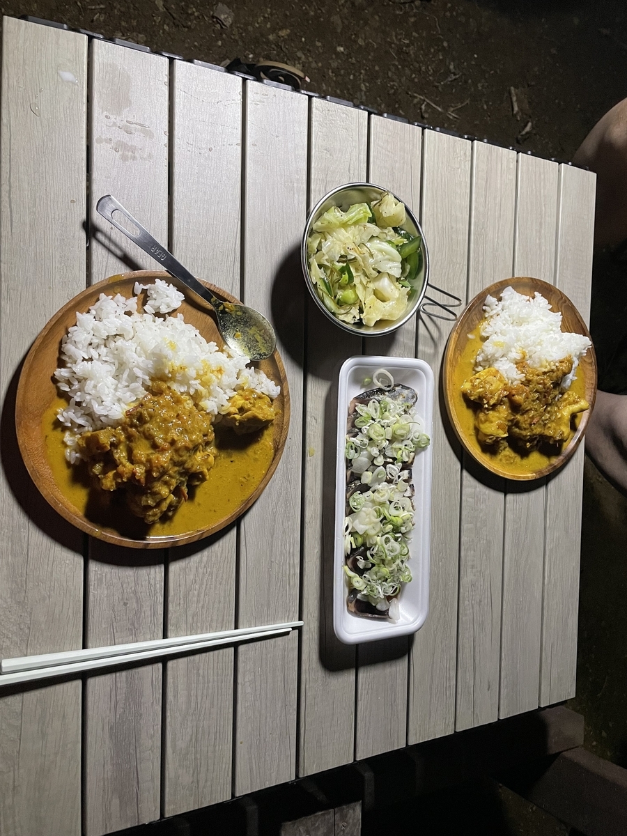 今日の夕飯は、カレーとカツオの刺身とキャベツ。カレーはワシ子でキャベツはわし夫。キャンプでカレーってやつを初めてやってみました。