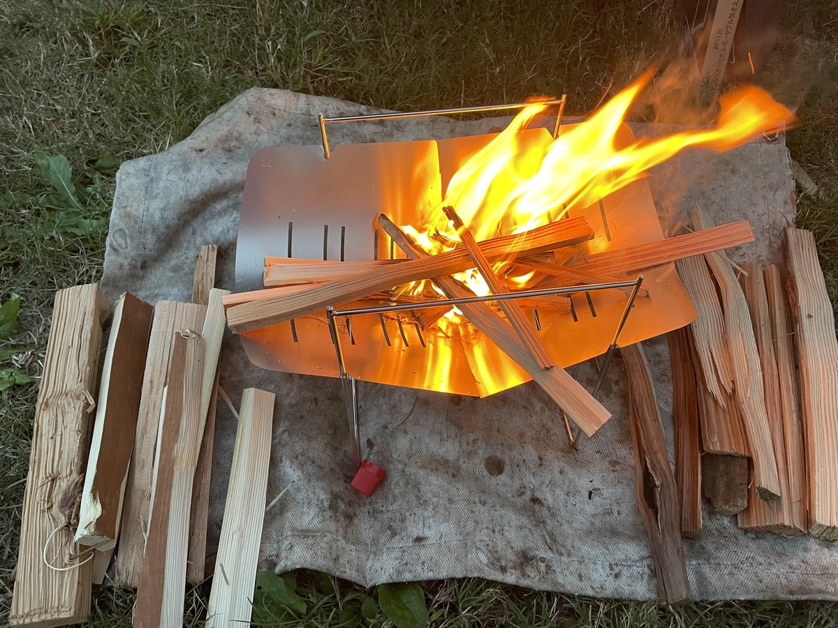 雨降りなので降っていないうちに焚き火します。(6月から焚き火してない、久々〜)今日は新しい焚き火台登場です。偽ピコグリルです💦暑い時期は全然焚き火したく無いけど夜肌寒くなってくると俄然火が恋しくなります。