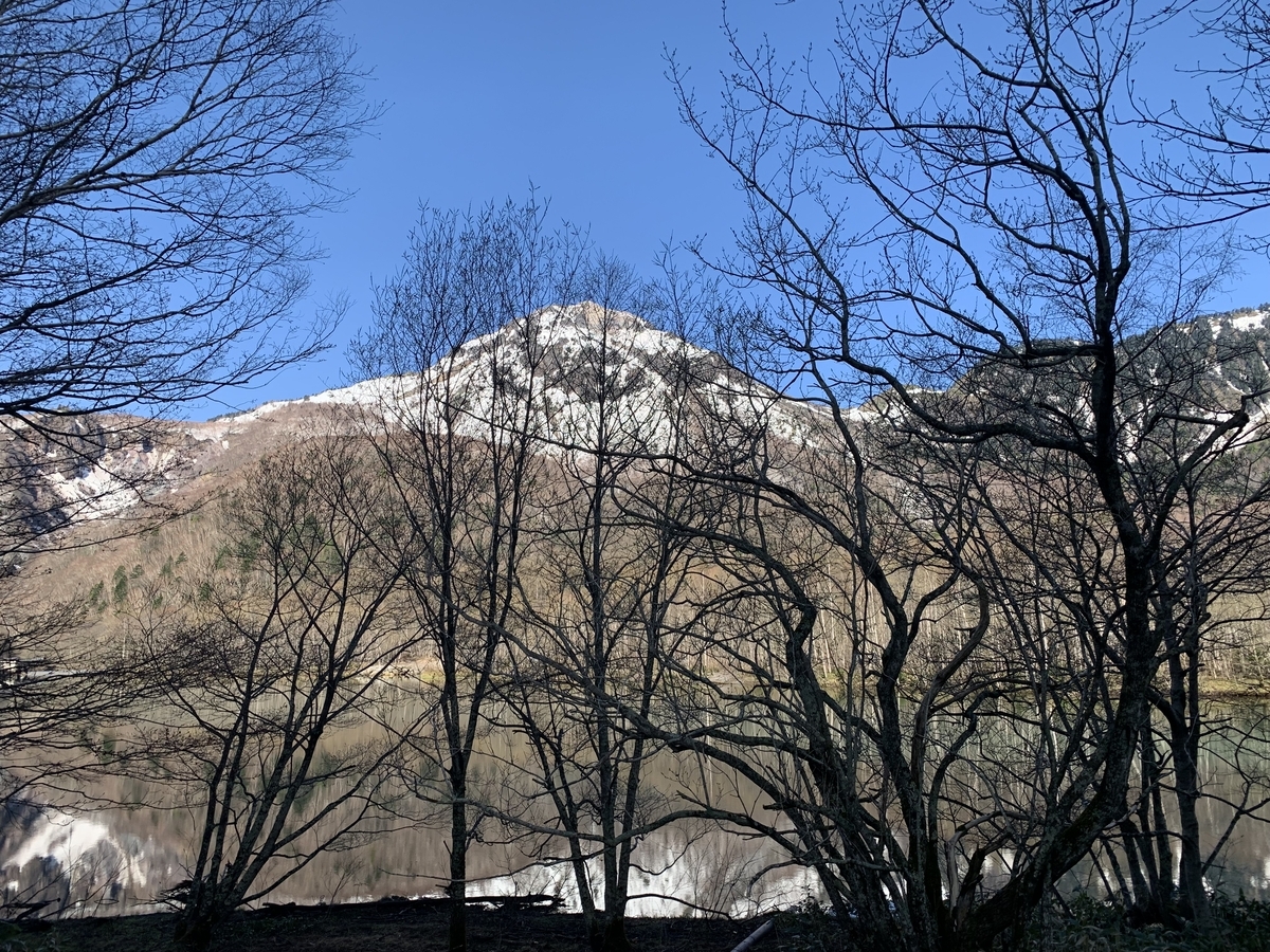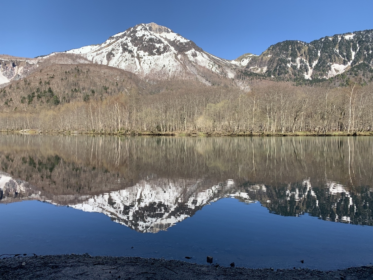 上高地バスターミナルの手前の大正池で降りて河童橋を目指すことにします。(田代橋まで林間コース、河童橋までは梓川右岸コース)バス停を降りて少し歩いただけで雪山が・・・美しい。そして大正池に行くと水面にくっきりと映る山々。もうテンションMAXです。